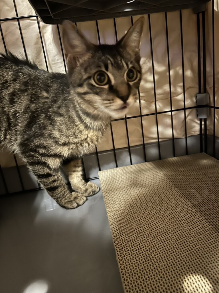 トリックは、現場で餌やりさんが与えるご飯や、時にはカエルを食べながら生き延びていました。当初、寄生虫の影響で食欲が少なく、駆虫治療を受けながら少しずつ健康を取り戻しました。そんなトリックは兄弟たちよりも少しシャイで控えめな性格。でも、家族と離れると甘えん坊な一面を見せる可愛い子猫でした。