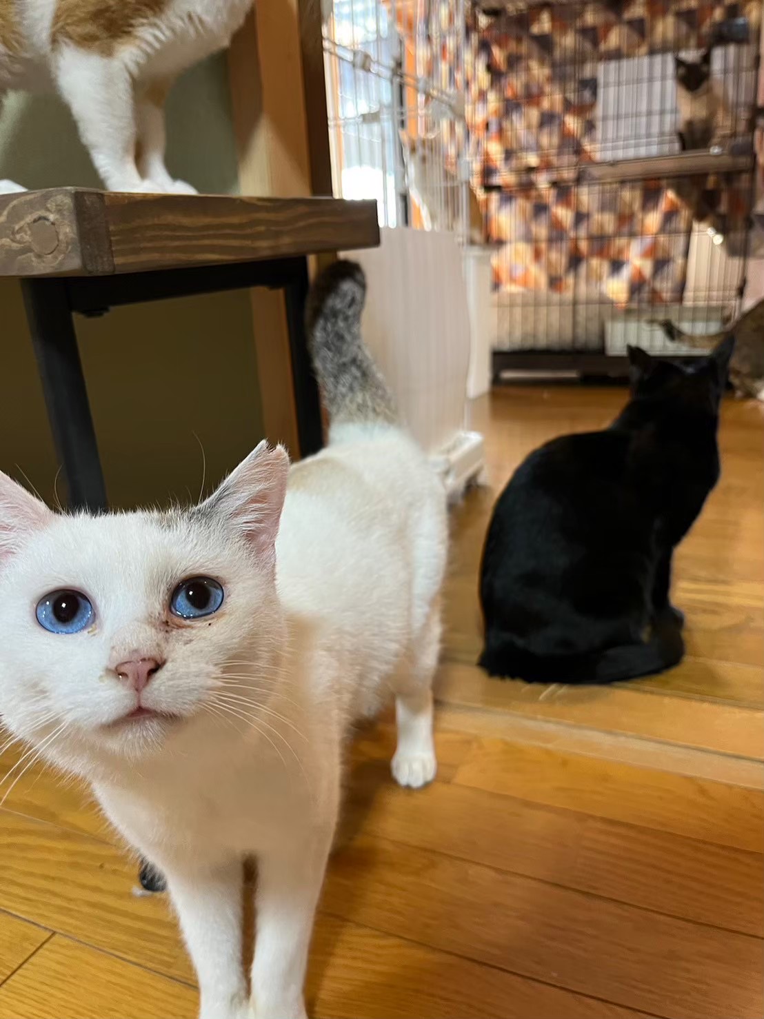 綺麗な青い目が特徴的。可愛い見た目ですがまだ人間は怖いのでゆっくり近づいてね。