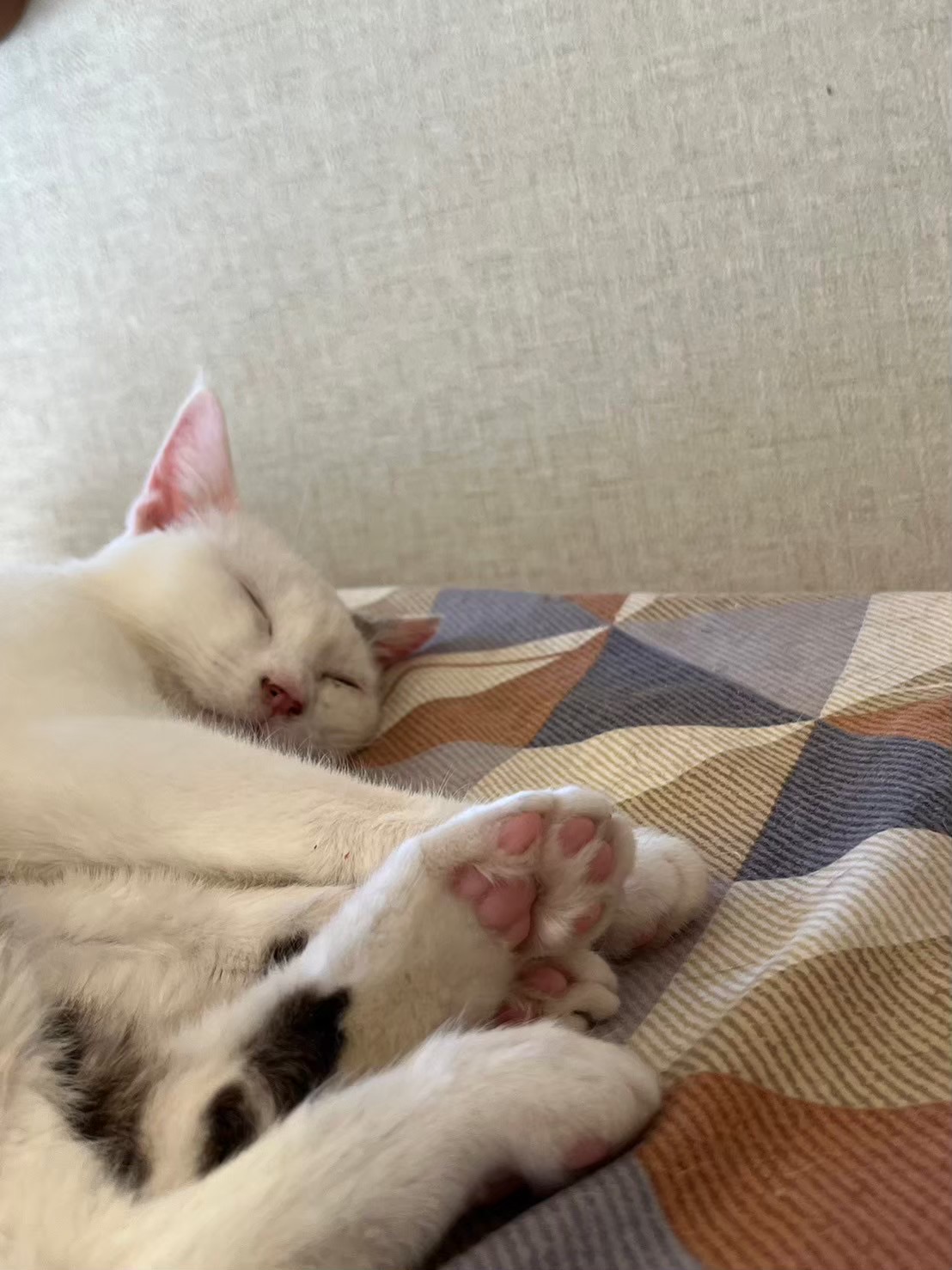 13日の夕方まではキャットタワーの上に寝ていましたが、夜遅くなると床でべたっと眠るようになりました。