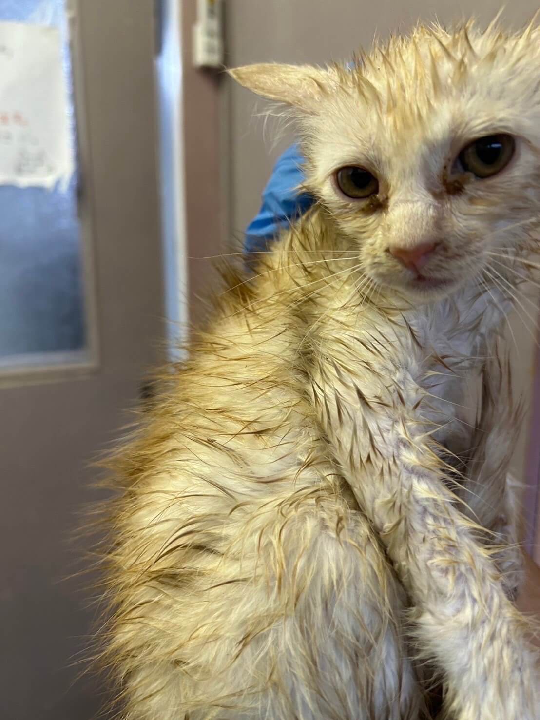 堤防の草の中で倒れて雨ざらしの子猫が居るとご来店されました。