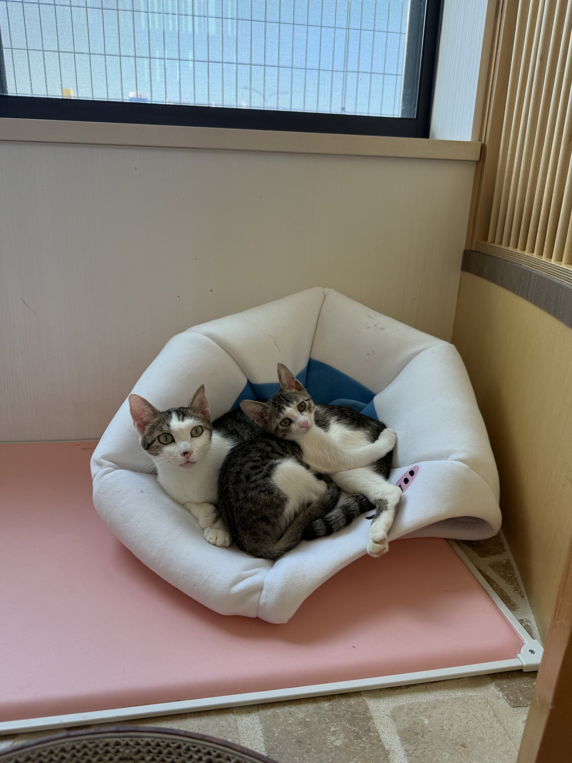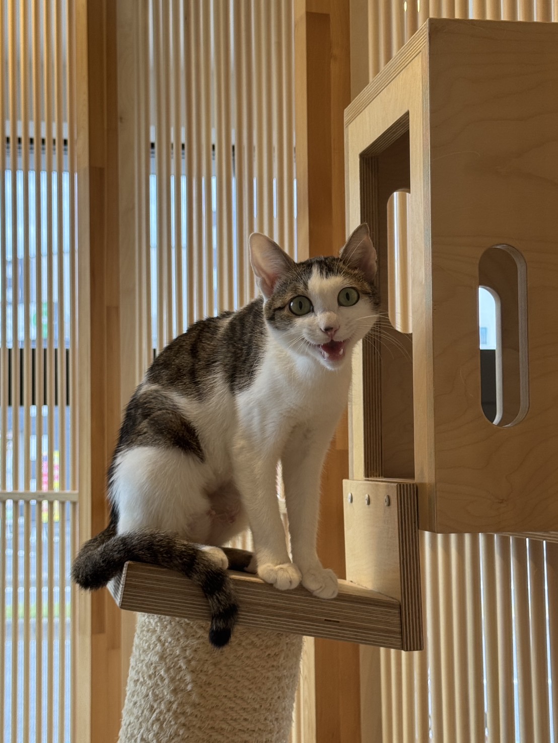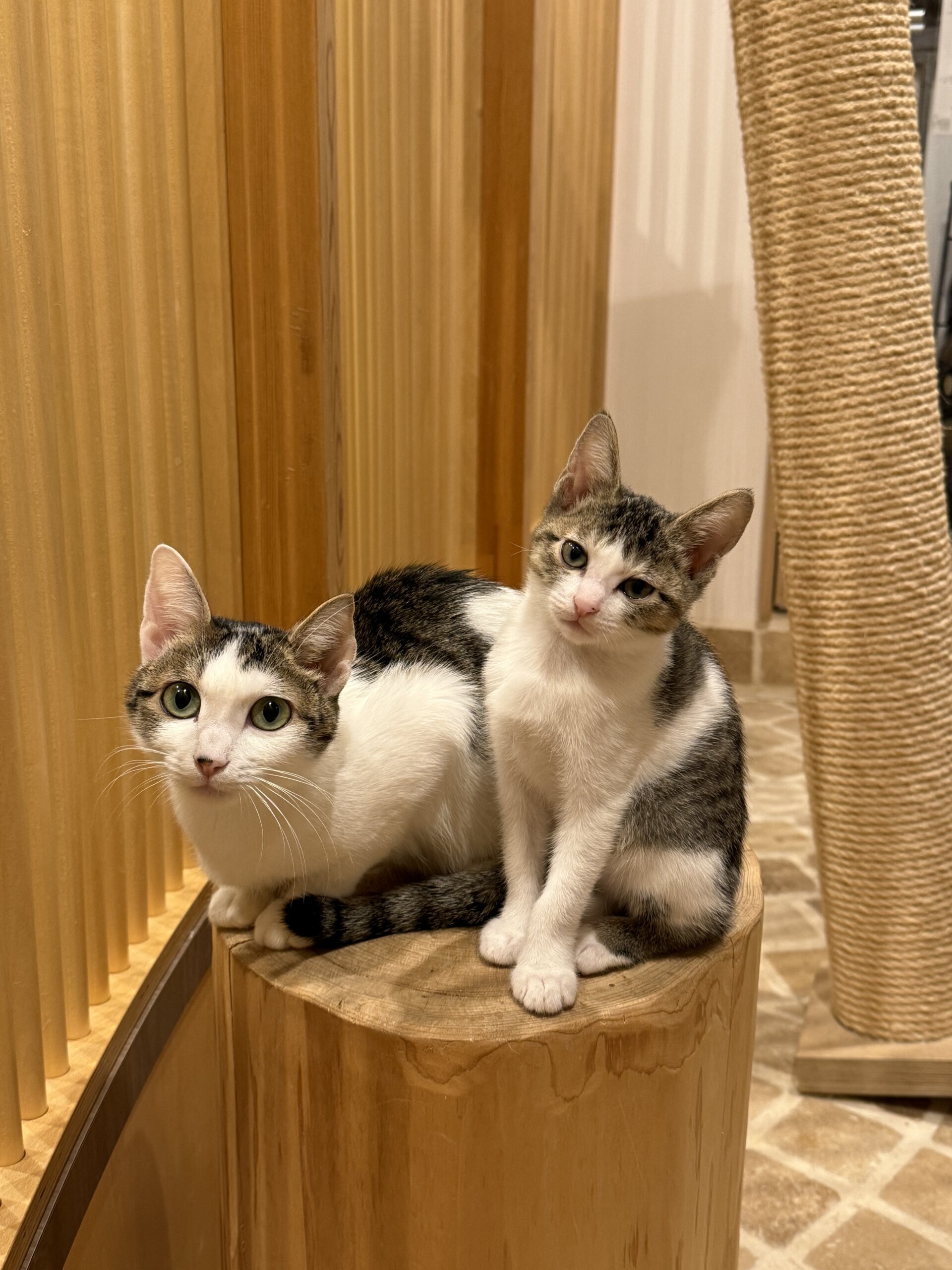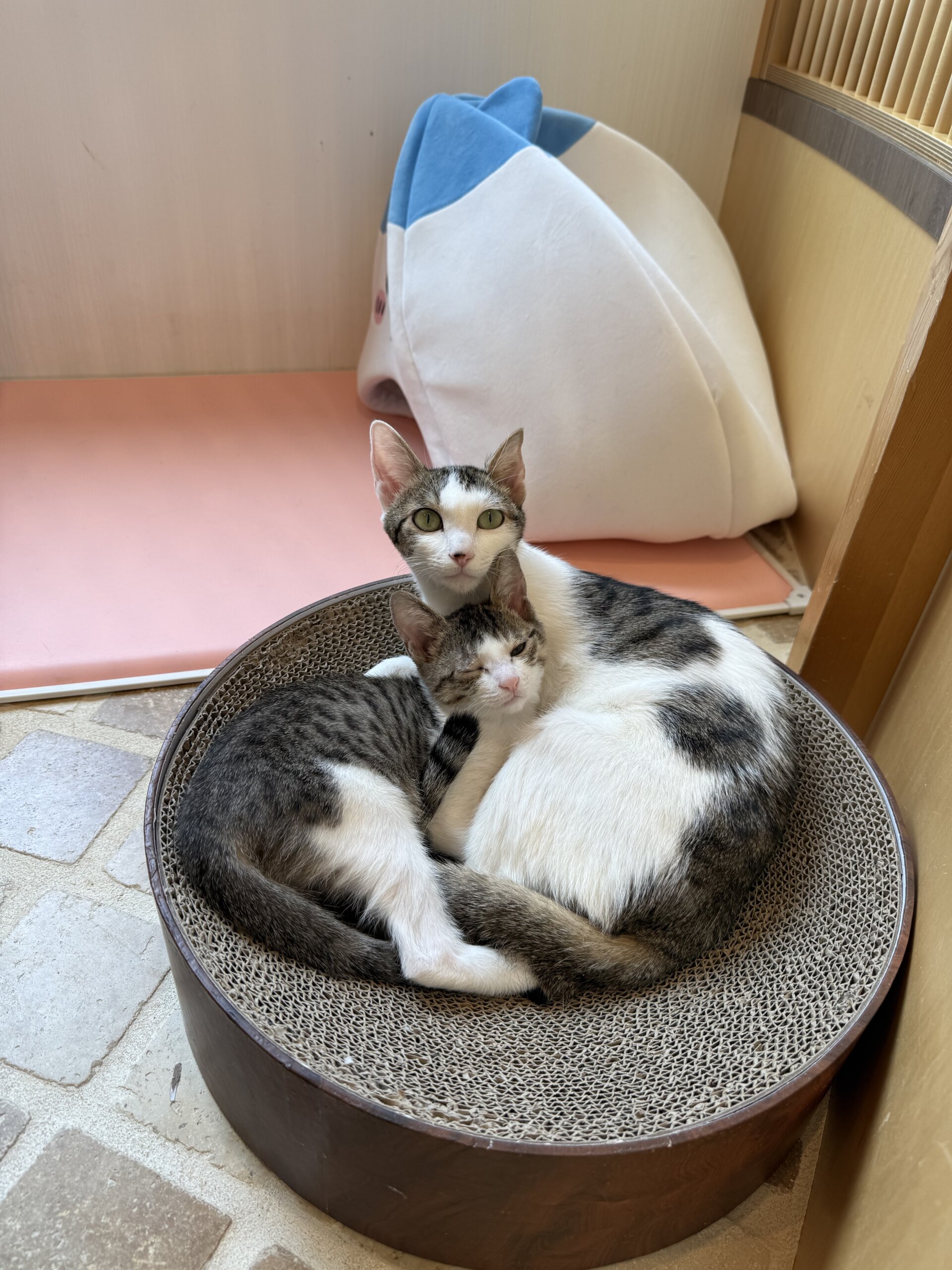 大福ちゃんは昨日来たばかりなのでまだビビり気味ですが、あんこちゃんが元気いっぱい走り回っているのを見て、早くもちょっとだけリラックスしてきた様子です🐈