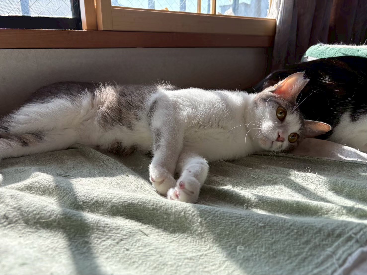 兄妹と一緒に固まっていましたが、段々と慣れてくれスリスリしたり、ご飯ちょうだい〜とアピールします。