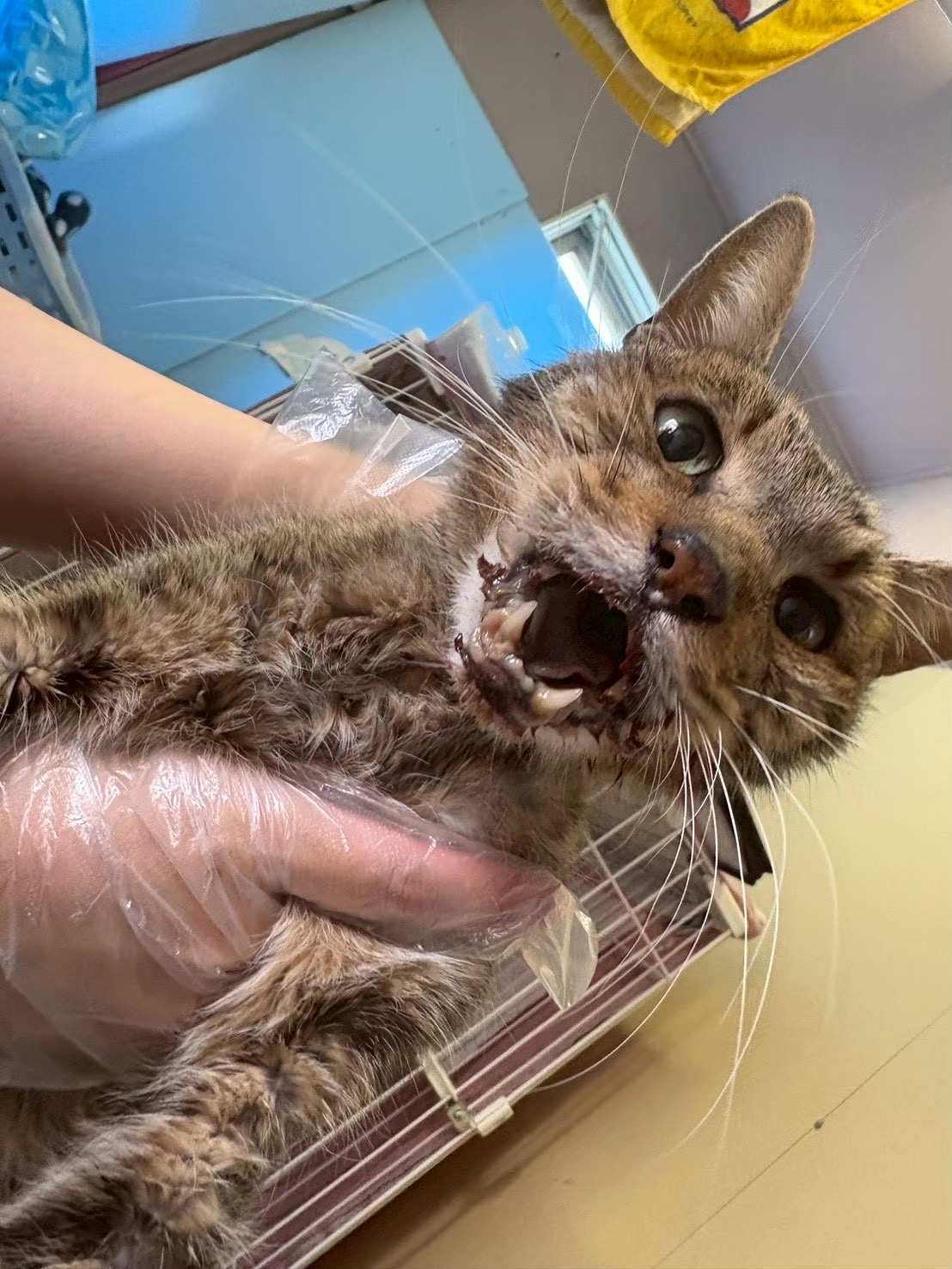 輪之内町 大藪小学校の近くの道路の真ん中で倒れているのを見つけた。事故かも。動物病院に連絡したところ、保護団体にまず連絡してと言われたそう。
