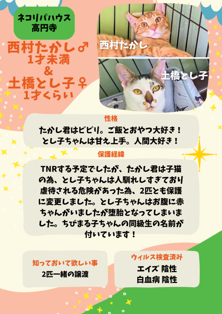 (※1歳未満の子猫については、2匹以上での引き取りをお願いしております)