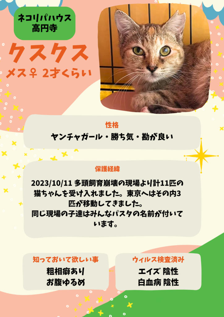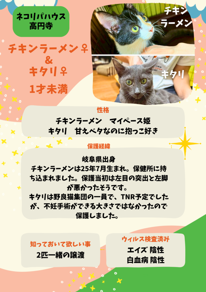 (※1歳未満の子猫については、2匹以上での引き取り、お留守番の短いご家庭でお願いしております)