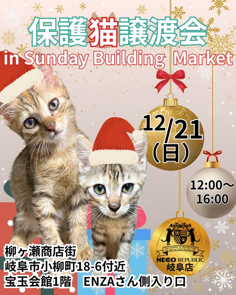 12月21日(日)、岐阜・柳ヶ瀬のサンデービルヂングマーケット(サンビル)で、ネコリパブリックの保護猫譲渡会を開催します🐾🐱
