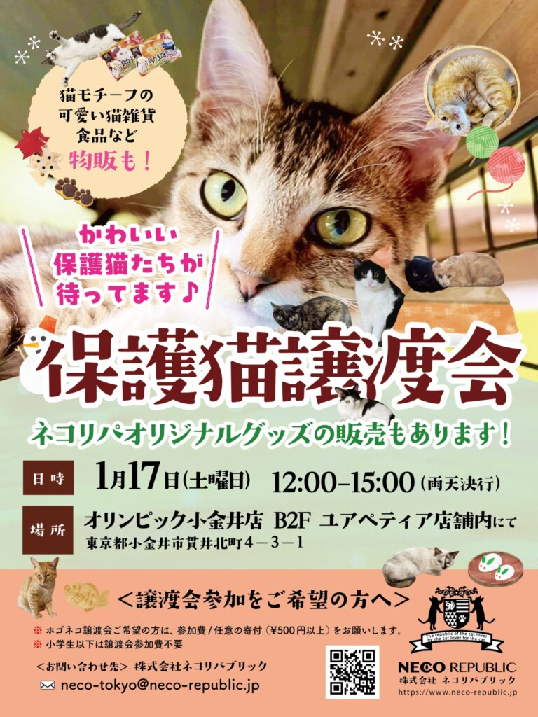 そこに在籍している個性豊かな猫たちに会える譲渡会を、オリンピック小金井店舗内 ユアペティア小金井店にて開催いたします!