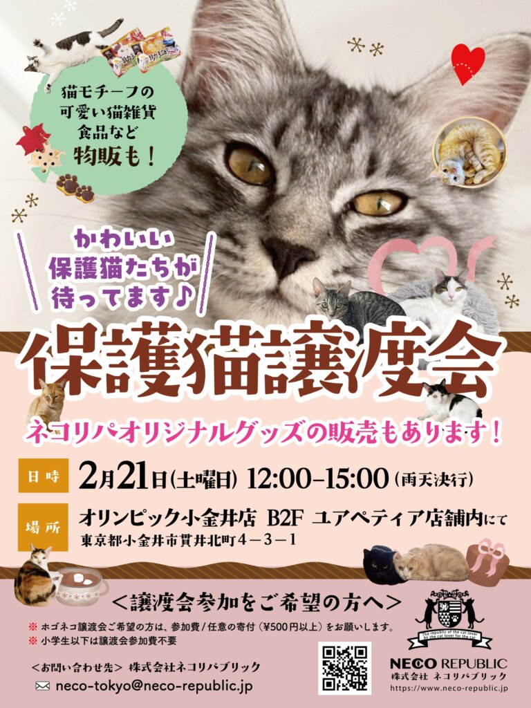 そこに在籍している個性豊かな猫たちに会える譲渡会を、オリンピック小金井店舗内 ユアペティア小金井店にて開催いたします!