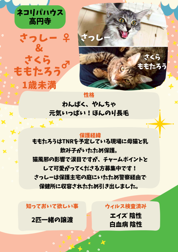 (※1歳未満の子猫については、2匹以上での引き取り、お留守番の短いご家庭でお願いしております)