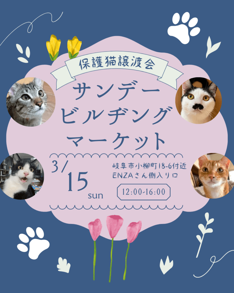 3月15日(日)岐阜・柳ヶ瀬のサンデービルヂングマーケット(サンビル)で、ネコリパブリックの保護猫譲渡会を開催します🐱