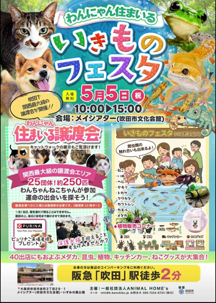 ゴールデンウィークの5月5日、大阪・吹田にて、関西最大級の譲渡会イベント「わんにゃん住まいるいきものフェスタ」が開催されます。
