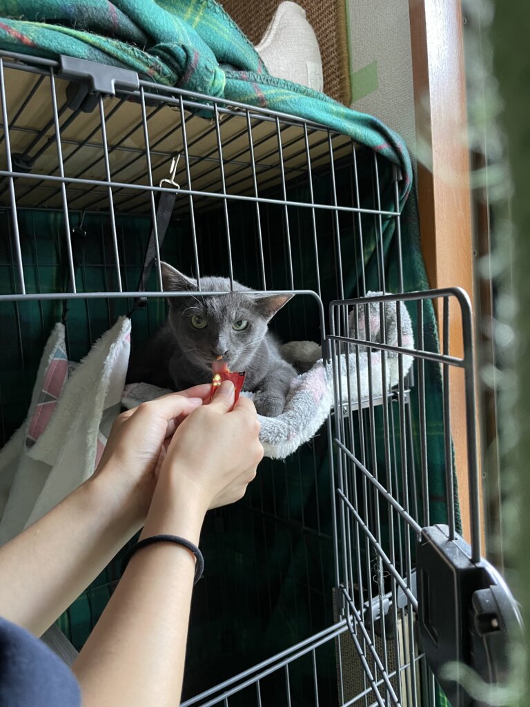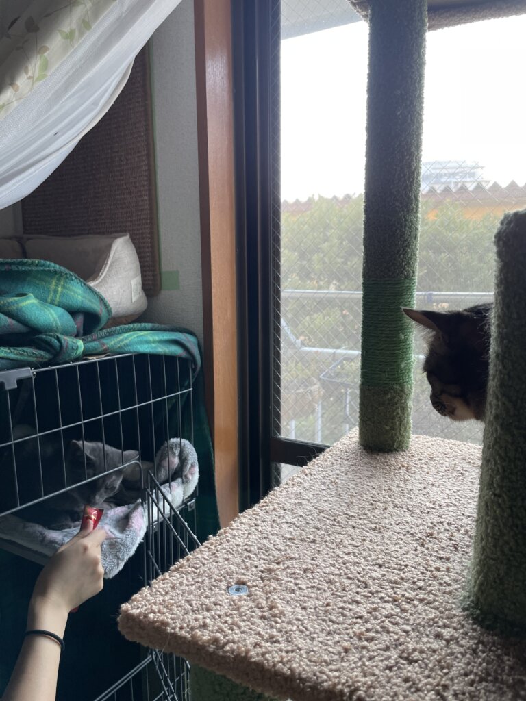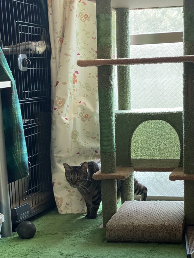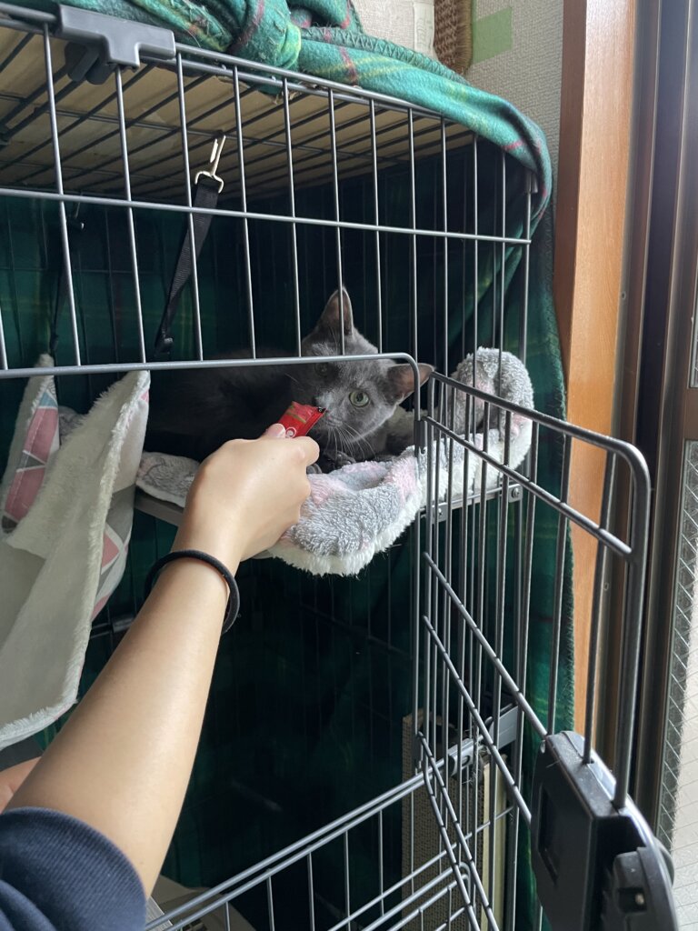 ネコリパブリック卒業の先住猫めんたくんが、キタリちゃんの存在が気になるようで少しずつケージに近づいていてました👀✨