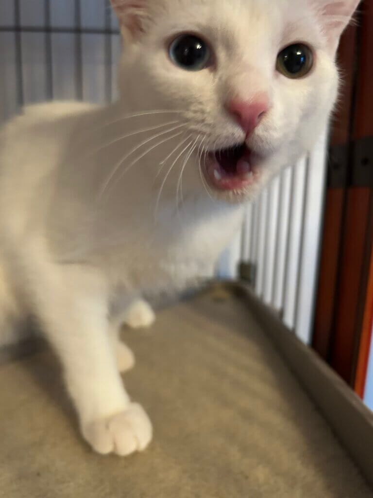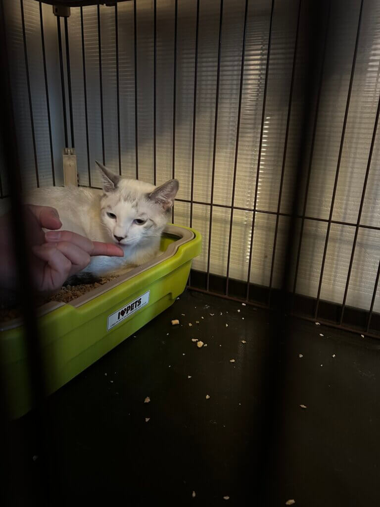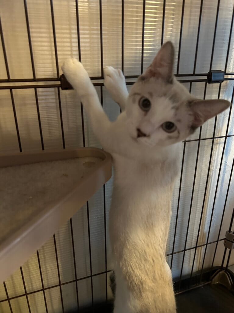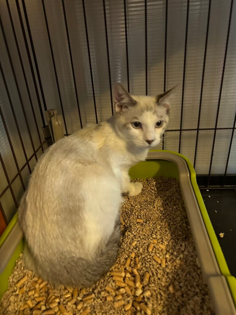 到着後ケージに入ってからもアマテラスは鳴いていましたが、少ししたら落ち着き、ちゅーる完食!しっぽを立ててゴロゴロ。😊