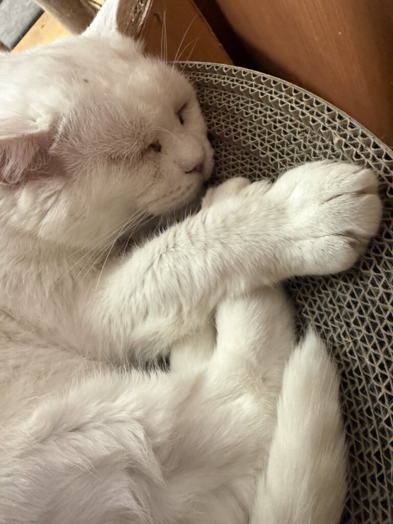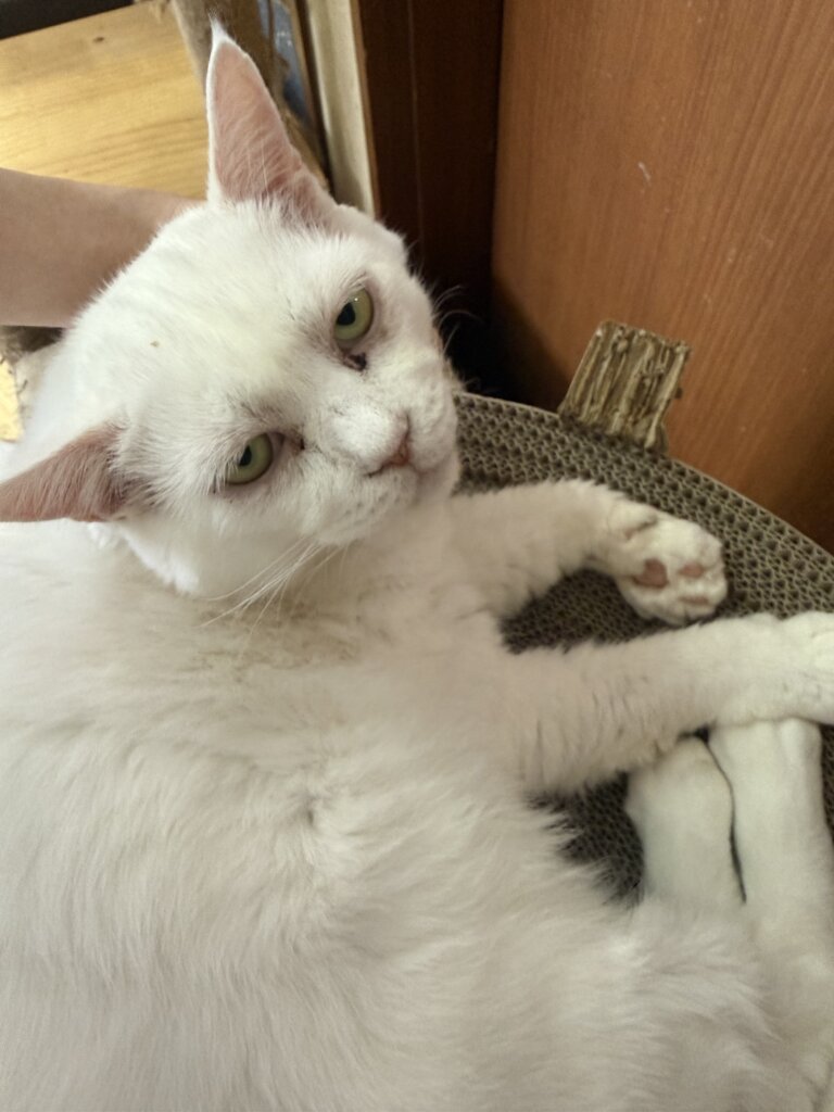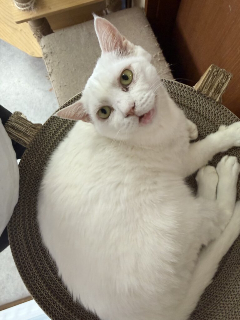 角度によっては怖い顔に見えますが、福の神のような人間のような…とっても存在感のある猫さんです。