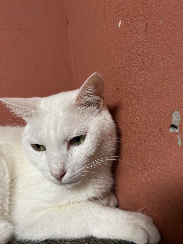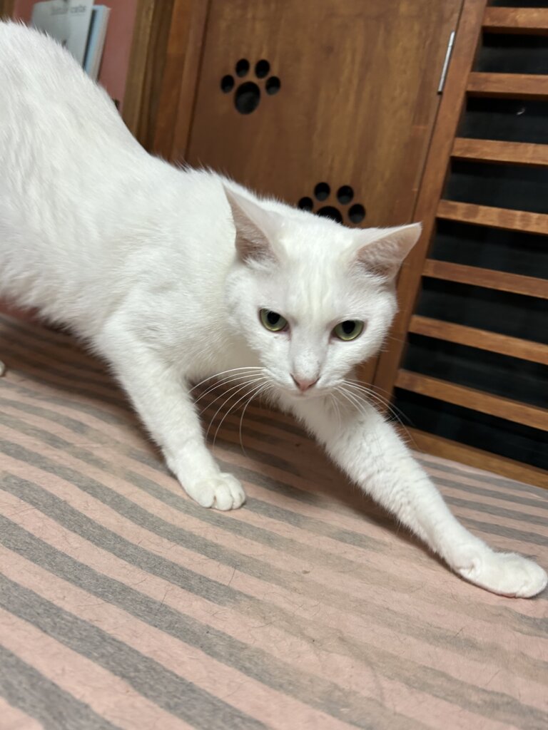 真っ白な体と、透き通るようなミント色の目が印象的な出雲くん。