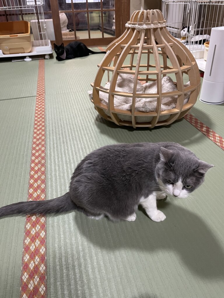 いつもはケージの上にいましたが、撫でて欲しいと「くるるるるる」と鳥みたいな声を出しておりてきました🐈