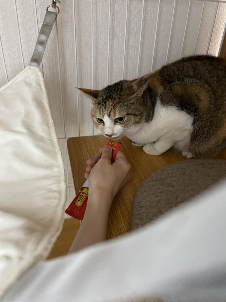 お届け時は、爪切りもすんなり、キャリーにもすんなり入ってくれるお利口さん。移動中も到着後もとても静かで、「ここどこ?」ときょろきょろしつつも、ちゅーるはしっかり爆食いでした😆