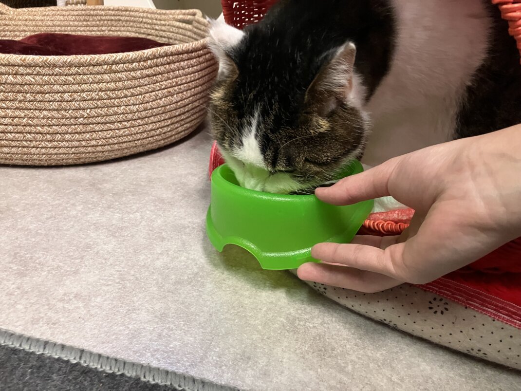 普段は人の手が見えるとシャーシャーですが、今日はご飯皿を持ち上げた状態で食べれました🩵