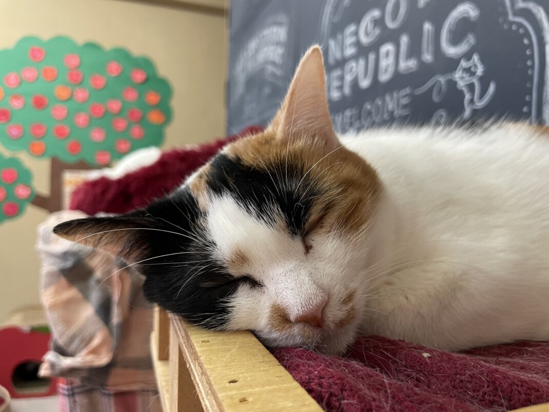 名前の由来は、保護した場所の一文字「こ」と、とって「もび」ねこさんだったので「こもび」です。