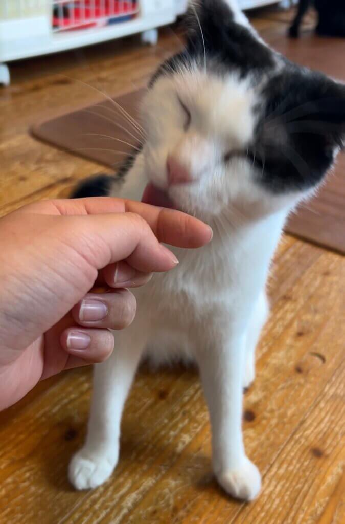 くるる【お茶の水】 【谷中店】~くるる~ 2024.08.02 (fri) 日々のこと Share スタッフの手を一生懸命追いかけるくるる 捕まえたっ! 美味しく頂かれました😋 でもガジガジしたお詫びに毛繕いしてくれる優しいくるるちゃんなのです☺️ 次の記事を見る 前の記事を見る カテゴリ一覧へ戻る くるる【お茶の水】 在籍ねこ 性別女の子 年齢1-3才 在籍店東京お茶の水店 毛色白黒 毛の長さ短毛 人馴れ度のんびり 人馴れ度デレデレ Comment 2022/5/10 昼頃に子猫3匹が排水溝にいるところを見かけたが、保護主さんご自身では保護できないと依頼…😢 2匹(ハル、リト)は元気みたいですが、1匹(くるる)は力無い感じだそうです。 くるるは自立で立てず、動こうとすると回ってしまい、ご飯も食べられない為、強制給餌しました。 兄妹と比べても体が小さかったです。 預かりさんにみてもらいながら、少しずつ自分で食べられる様になり元気に動ける様になっていきました😊 物にぶつかったりもしますが、日常生活も問題なく元気に大きくなりました。 とっても甘えん坊さんです😻 いまでは、カフェを自由きままに走り回り元気いっぱいです。 ちょっと空気が読めないところが可愛くて仕方ありません。 2024/3/27東京へ移動してずっとのお家を探します♪ おすすめの記事 東京谷中しにものぐるい店 くるる【お茶の水】 2025.09.04 (thu) 【谷中】〜くるる〜 東京谷中しにものぐるい店 くるる【お茶の水】 2024.08.06 (tue) 【谷中店】~くるる~ 東京谷中しにものぐるい店 くるる【お茶の水】 2024.07.27 (sat) 【谷中店】~くるる~ 人気の記事 イベントレポート 2020.04.06 (mon) 緊急募集!ネコリパブリック運営継続月額サポーター!あなたのちょっとで猫助け! 猫コラム 2020.03.01 (sun) りんご猫とは、、 猫コラム 2021.06.07 (mon) りんご猫とは、、 猫エイズについて